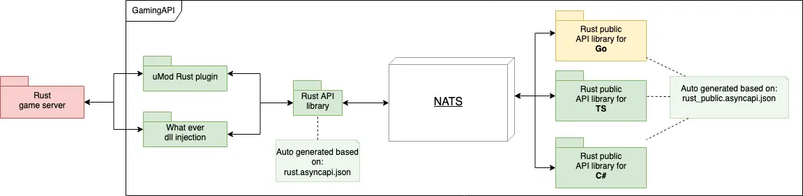 For Rust, the game API is the first one defined which is for the game server itself, that defines what it provides and consumes. The game API needs a library generated in the programming language that enables us to hook into the game server. For example for Rust (as it is built with Unity), C# is the primary programming language that would be needed. For Minecraft, it would be Java.